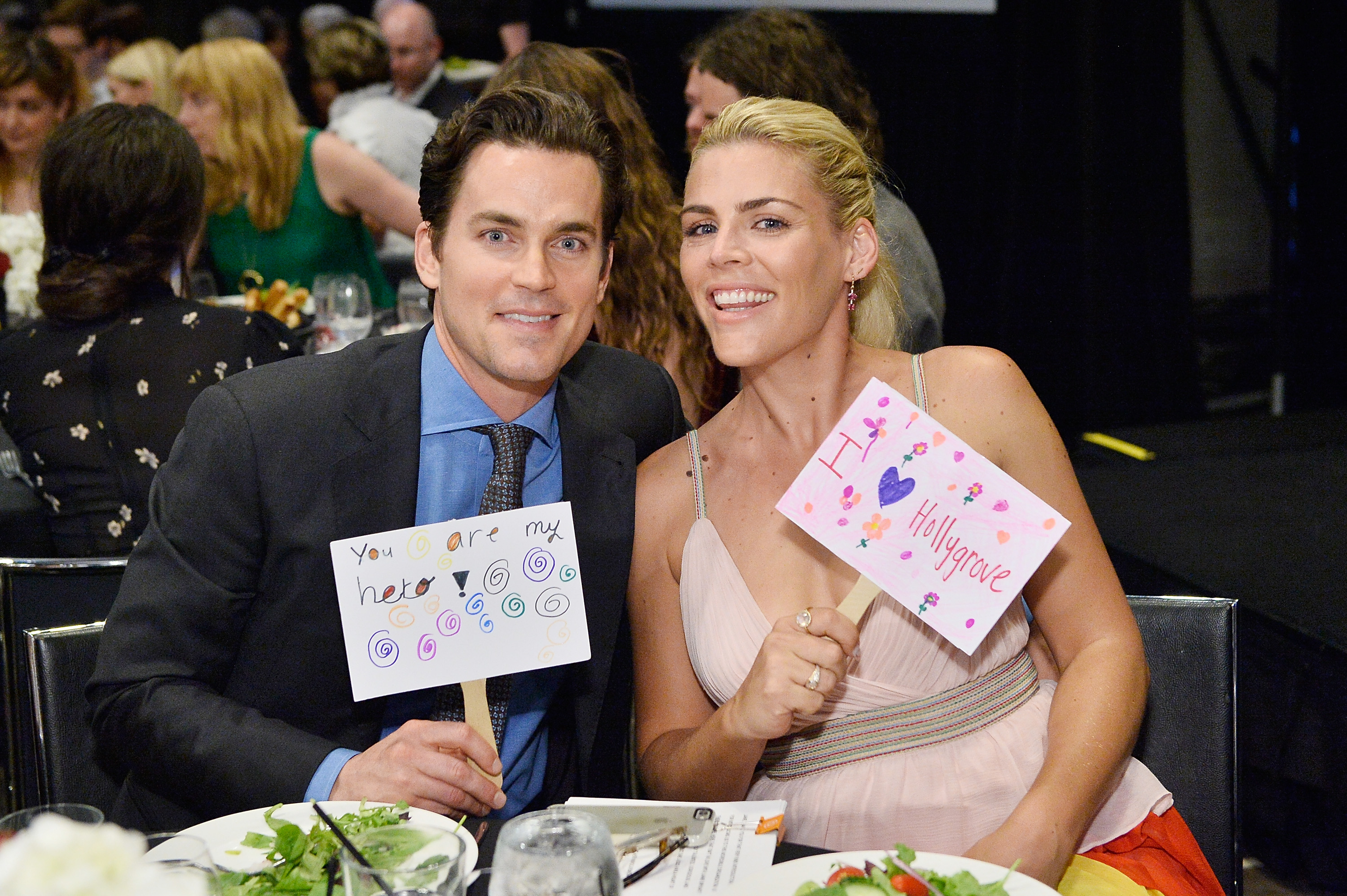 Matt Bomer and Busy Philipps raise their auction paddles during Uplift Family Services at Hollygrove Gala
