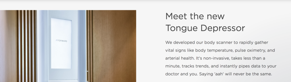 A Modern Experience: Gone are the days of sitting in a cold exam room alone in a Johnny gown. Forward provides patients with an inviting experience, complete with complimentary Lululemon athletic gear, and smart touchscreen displays to guide the way