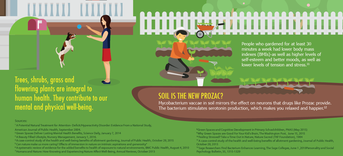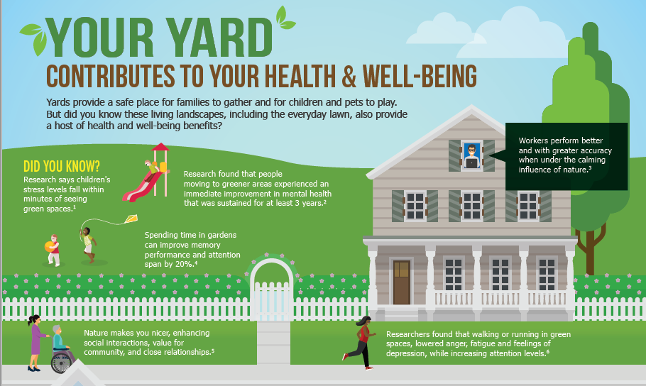 All of these benefits reinforce the importance of maintaining our yards, parks and other community green spaces. Trees, shrubs, grass, and flowering plants are integral to human health. Not only do they provide a place for kids and pets to play, they directly contribute to our mental and physical well-being.