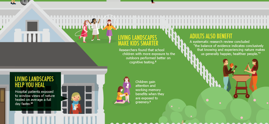 Living landscapes help you heal faster. Multiple studies have discovered that plants in hospital recovery rooms or views of aesthetically-pleasing gardens help patients heal up to one day faster than those who are in more sterile or austere environments.